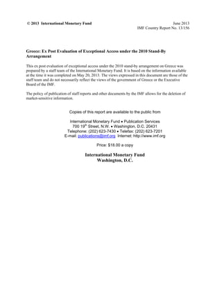 The IMF conducted an ex post evaluation of Greece's 2010 Stand-By Arrangement (SBA), which provided exceptional access of €30 billion to support Greece amid its debt crisis. While the SBA achieved strong fiscal consolidation and pension reform, it failed to restore market confidence or curb high unemployment. Debt remained too high and had to be restructured. The evaluation found that rapid fiscal adjustment was necessary but the program overestimated Greece's ability to implement structural reforms. The SBA highlighted lessons for the IMF in accommodating currency unions and ensuring sufficient program ownership.