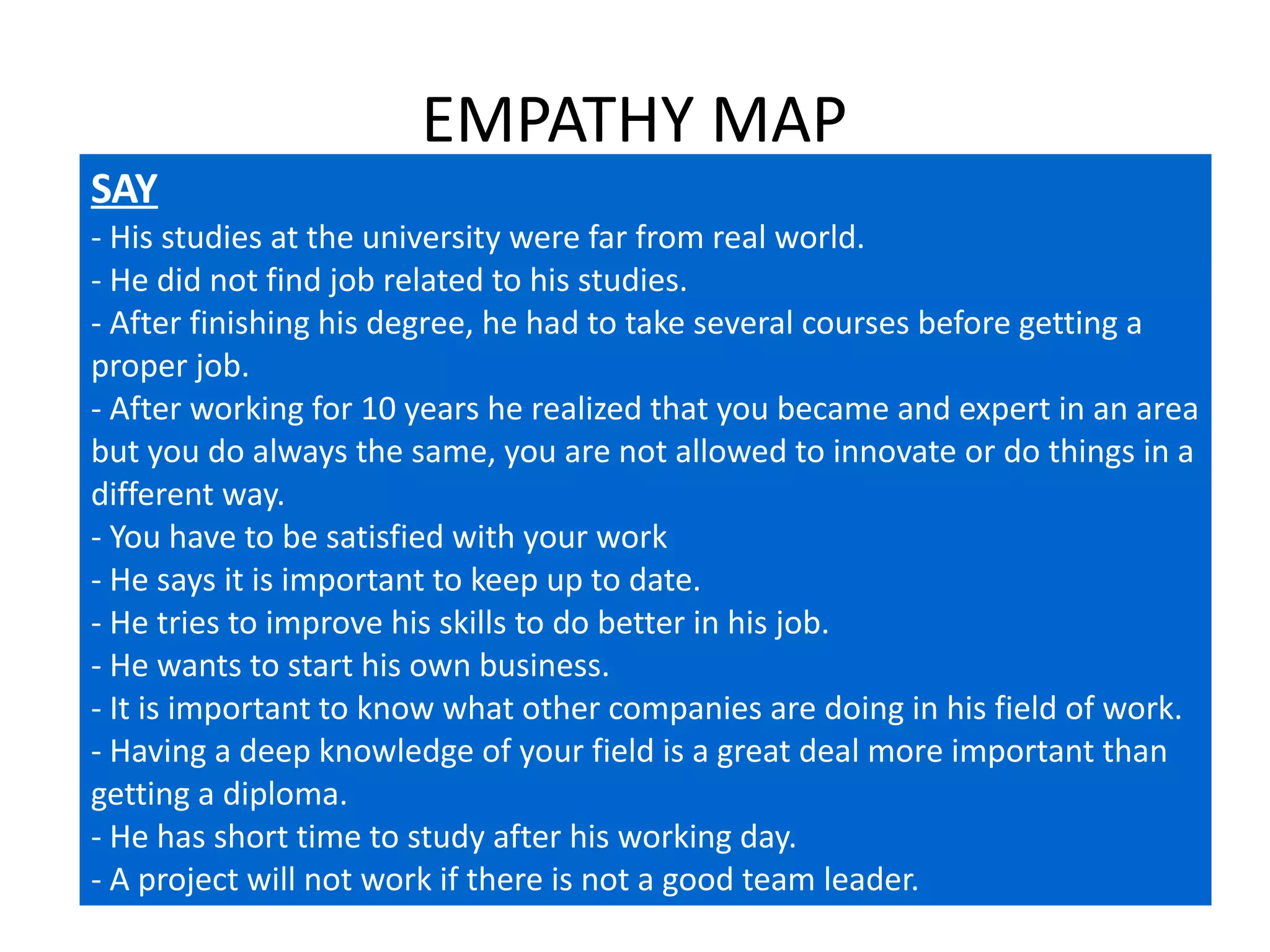 Jules is a 40-year-old computer scientist who was laid off in 2008. He decided to pursue further education to improve his career. He now works as a computer scientist and studies online to keep his skills up to date. He feels he has little time to develop his ideas fully and wants to start his own business but lacks opportunities to meet others to collaborate with. The problem is that Jules has many career goals and ideas but needs a way to better share and develop them through connecting with other professionals.