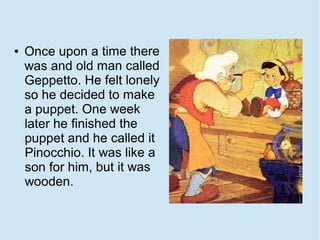 Geppetto, a lonely old man, carved a puppet named Pinocchio. A fairy godmother brought Pinocchio to life but warned that if he lied, he would turn back into wood. Pinocchio disobeyed by going to the funfair instead of school and later lied about it, causing his feet to grow. For continued lying, the fairy turned him into a robot. When Pinocchio lied again about how he became a robot, the fairy turned him into a car so he and Geppetto could travel the world together.