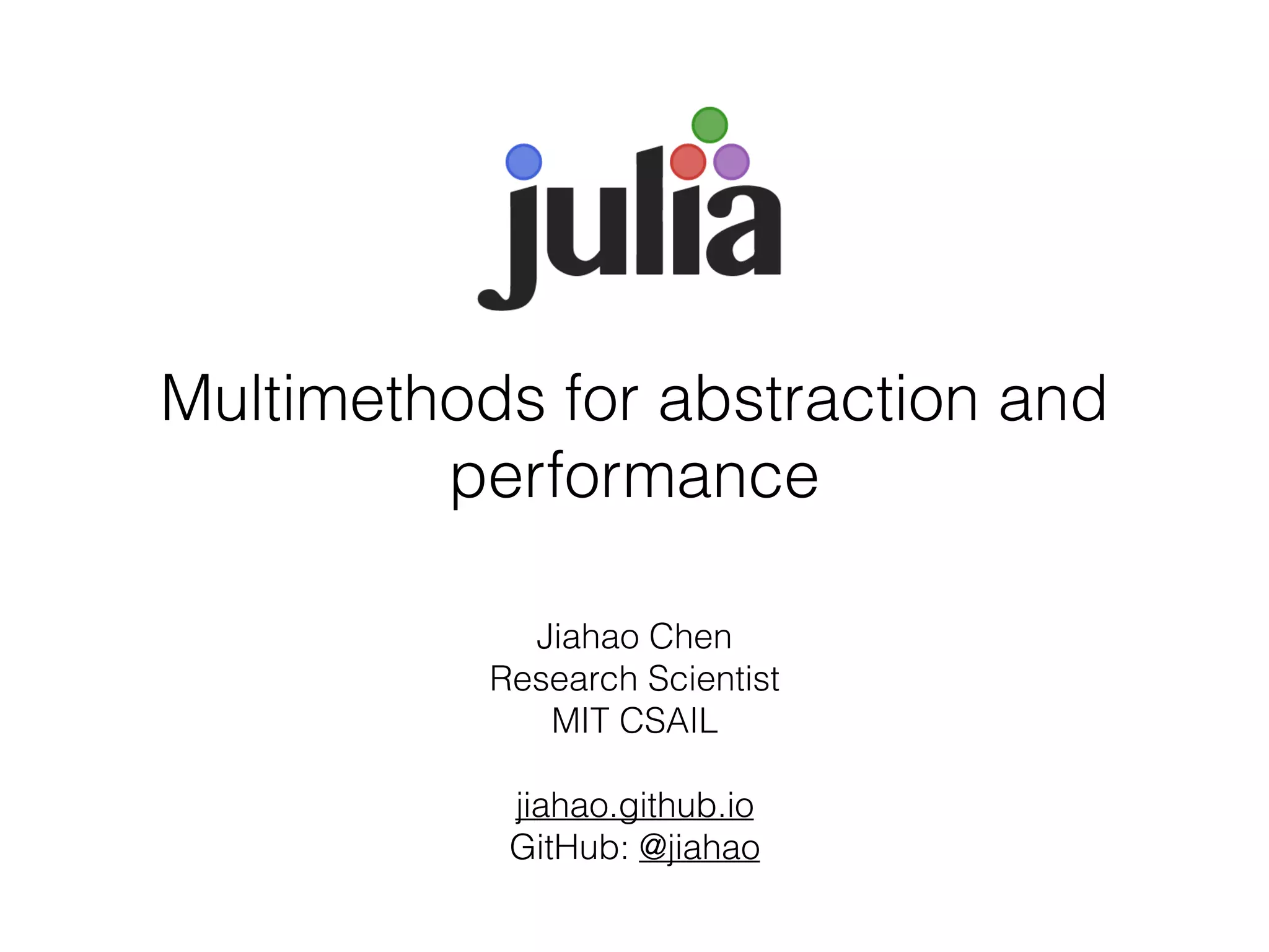 This document discusses Julia's use of multimethod dispatch and generic functions to provide both data abstraction and high performance. Julia bridges the divide between computer science and computational science by allowing users to write generic code that can also achieve native machine performance when applicable. Its type system and multimethods allow methods to be specialized for different argument types, enabling both abstraction and optimized implementations.