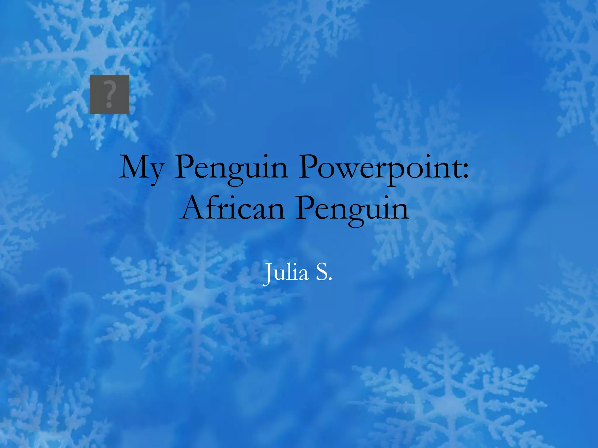 The document is a PowerPoint presentation about African penguins. It discusses that African penguins live in South Africa and over 800 died recently. They eat small fish, krill, and shrimp by regurgitating food for their chicks. African penguins have black feathers on their back and white feathers on their front, with webbed feet and a narrow beak that is black on top and white on bottom. The presentation notes that the student likes African penguins because their population is around 180,000 pairs that live on islands off the coast of southern Africa, eating fish and krill and nesting in burrows under rocks or sparse vegetation.