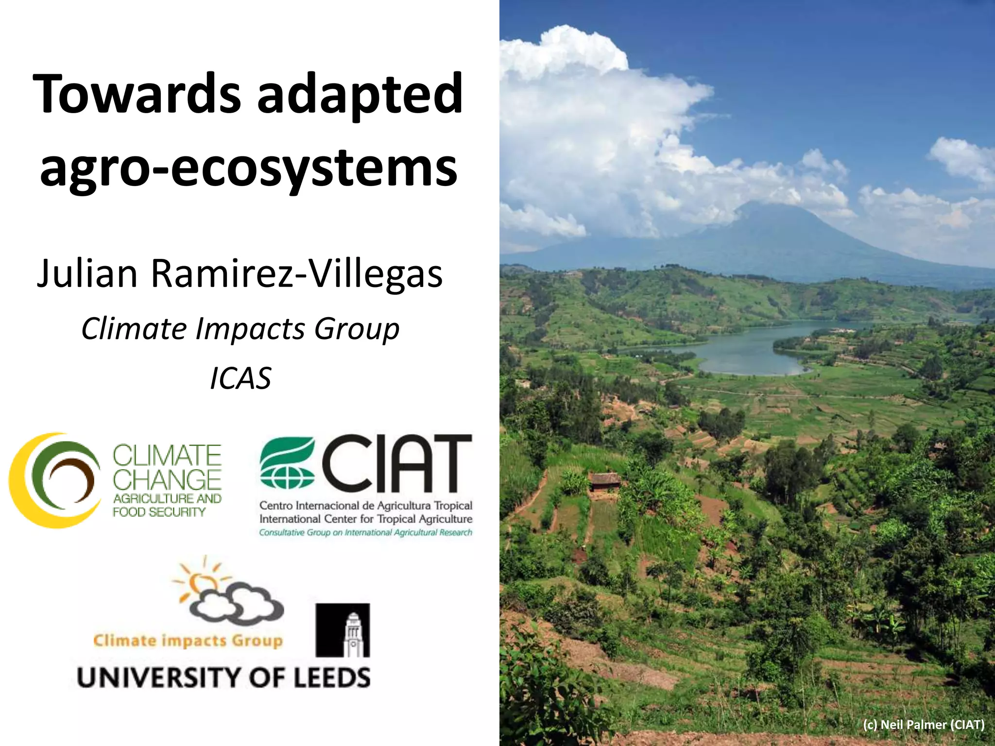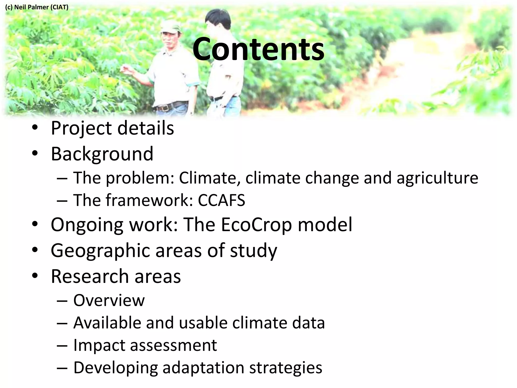 This document summarizes an ongoing project that aims to inform the adaptation of agricultural systems in Africa and Asia to progressive climate change over coming decades. The project uses crop modeling and climate impact assessments to evaluate vulnerabilities and develop adaptation strategies. Key aspects of the work include using the EcoCrop model to assess climate suitability of crops, analyzing available climate data and uncertainties, selecting priority crops and regions to study, and exploring genetic and management adaptations to test via modeling and promote to farmers. The overall goal is to contribute to the CCAFS program by analyzing climate-vulnerable areas and facilitating climate-resilient agriculture.