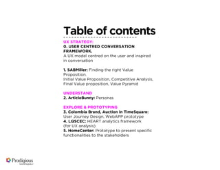 This document discusses a UX strategy project for SABMiller events. Initial user research found two target profiles: young people seeking social events and families looking for weekend activities. However, interviews revealed users' true needs went beyond SABMiller's proposed marketplace. A competitive analysis showed vertical platforms better satisfied users with event-specific content. The strategy was pivoted to focus on SABMiller's own events, addressing user needs throughout the experience from discovery to post-event. This ensured the platform provided value to users rather than just listing all events.