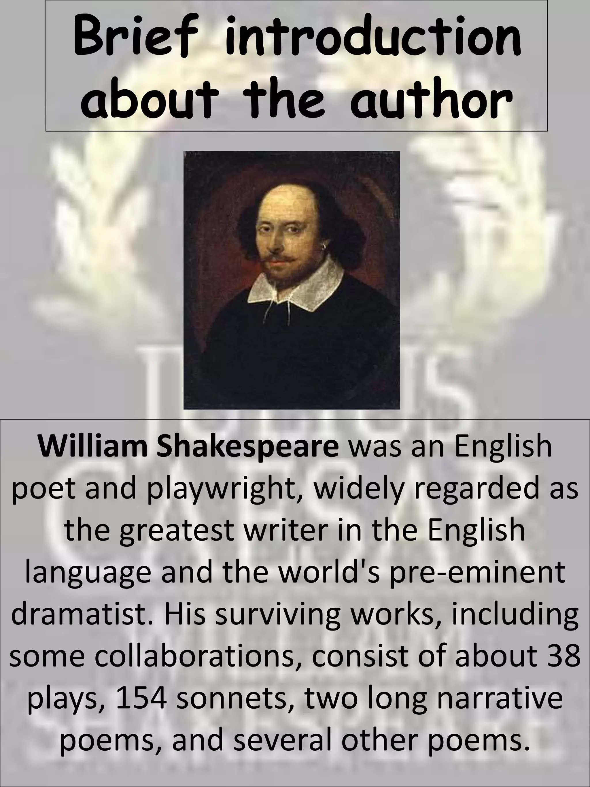 1) Julius Caesar was a powerful Roman general and ruler who was assassinated on March 15, 44 BC by a group of conspirators led by Cassius and Brutus.