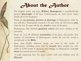 William Shakespeare, regarded as the greatest playwright, authored 'Julius Caesar', a tragedy believed to be written in 1599, illustrating the conspiracy and assassination of the Roman leader Julius Caesar and the ensuing civil war. The play highlights Marcus Brutus' moral struggle as the central character, despite Caesar being the title figure, reflecting societal anxieties over leadership succession during Queen Elizabeth's time. Major themes include the corruptive nature of power and the conflicts of honor, loyalty, and ambition among the characters.