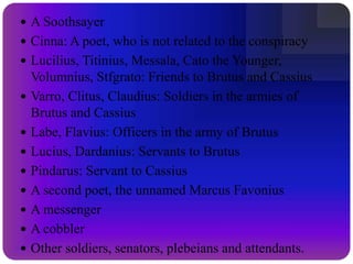 The document provides biographical information about William Shakespeare and summarizes the play Julius Caesar by Shakespeare. It discusses key characters like Brutus, Cassius, and Mark Antony and their roles in the conspiracy to assassinate Julius Caesar. The summary describes how Brutus is convinced to join the conspiracy, the assassination of Caesar on the Ides of March, and how Mark Antony turns public opinion against the conspirators with his famous speech over Caesar's body.