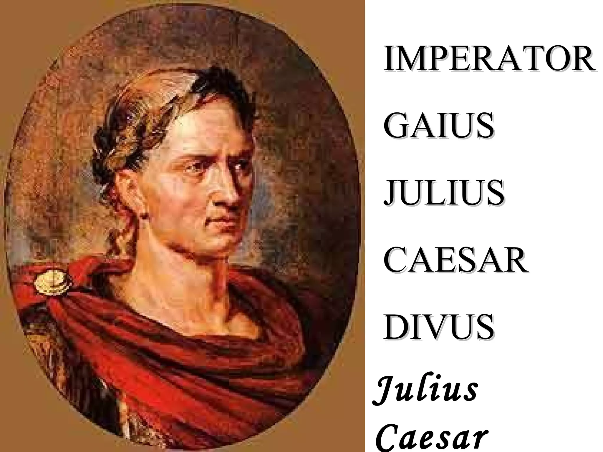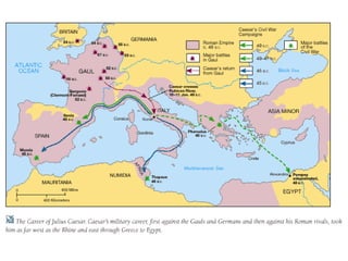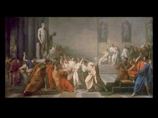 Julius Caesar was a prominent Roman military leader who became dictator, angering some senators who saw him as a threat to the Roman Republic. On the Ides of March in 44 BC, a group of senators led by Brutus and Cassius assassinated Caesar. This sparked a power struggle in Rome between Brutus, Cassius and Mark Antony that led to civil war and the rise of the Roman Empire under Augustus.