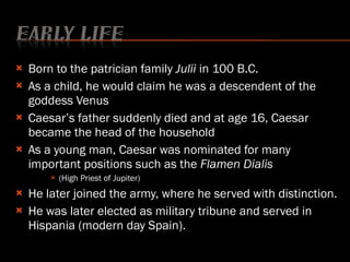 Born in 100 BC to a patrician family in Rome, Julius Caesar rose to become a powerful politician and military leader through his accomplishments and alliance with other powerful figures. As dictator of Rome, he enacted several reforms but was assassinated in 44 BC by a group of senators led by Brutus, who feared Caesar was becoming too powerful. His death sparked another civil war as Mark Antony and Octavian fought for control of Rome.