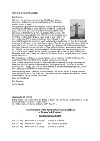 The document is a letter from Reverend Jennie Appleby discussing two sporting events - the World Cup and the Street Child World Cup. It summarizes that while the World Cup was a highly publicized event in Brazil, the Street Child World Cup involving teams of homeless and orphaned children from around the world received less attention. It describes an English girls' team from the event who came from difficult backgrounds in London but demonstrated teamwork and friendship. Though they did not win, they gained hope and happiness from the experience. The letter suggests both events can bring hope and transformation in life through friendship and faith in God.