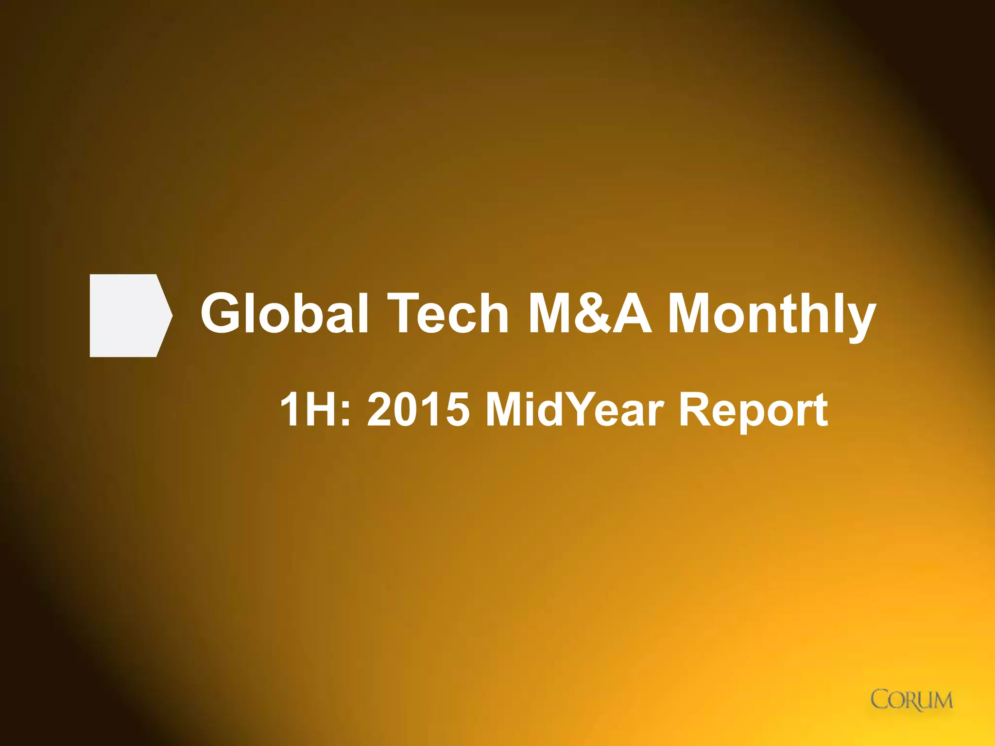 The document is a midyear report for global tech mergers and acquisitions (M&A) in 2015, outlining key industry figures and notable transactions such as Accela's acquisition of Decade Software and Vertafore's acquisition of QQ Solutions. It highlights strong financial markets, low debt costs, and disruptive trends as reasons for continued strength in tech M&A, while also providing insights into upcoming events and market valuations. The report includes analyses of strategic and private equity acquirers, along with detailed statistics on deal volumes and values across different regions.