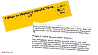 This document provides an agenda for a 3+ hour workshop on Apache Spark 2.x on Databricks. It includes introductions to Databricks, Spark fundamentals and architecture, new features in Spark 2.0 like unified APIs, and workshops on DataFrames/Datasets, Spark SQL, and structured streaming concepts. The agenda covers lunch and breaks and is divided into hour and half hour segments.