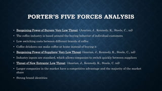 The document analyzes Jumpin' Java Shop's social media marketing plan. It performs a Porter's Five Forces analysis, finding low bargaining power of buyers and suppliers but high threat of substitutes and rivalry. A SWOT analysis identifies strengths like community focus but weaknesses in social media presence. Goals include increasing traffic and satisfaction. Tactics propose discounts for social shares and engaging content. Key performance indicators to track include word-of-mouth, share of voice, conversation reach, and customer satisfaction.