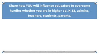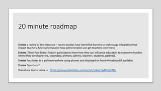 This document summarizes a presentation about overcoming barriers to technology integration in education. The presentation discusses how teachers face internal and external barriers to technology use in the classroom. It reviews literature identifying these barriers and a study that examined how some teachers successfully overcame attitudinal, social/cultural, and pedagogical barriers. The study found teachers did so through adapting technology skills, peer support, training, having appropriate resources, and valuing technology. Administrators can help by providing development, support, time for skills to evolve, and encouraging new instructional approaches.