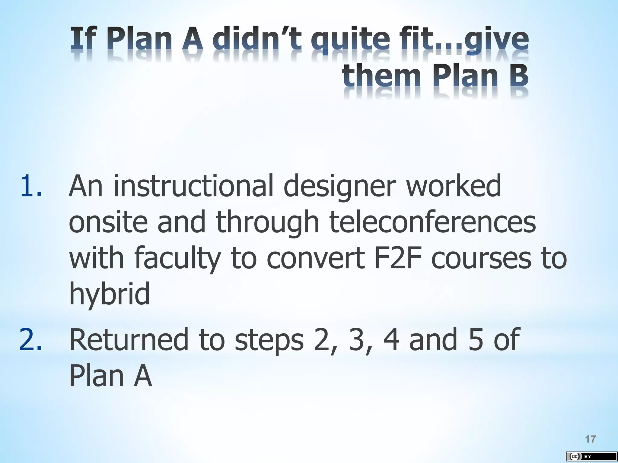 CCCS successfully moved many Career and Technical Education (CTE) courses to blended/hybrid formats. Originally only 15 of 122 relevant courses were hybrid, but a deadline of December 2013 required all 122 be hybrid. CCCS developed a plan with the following steps: