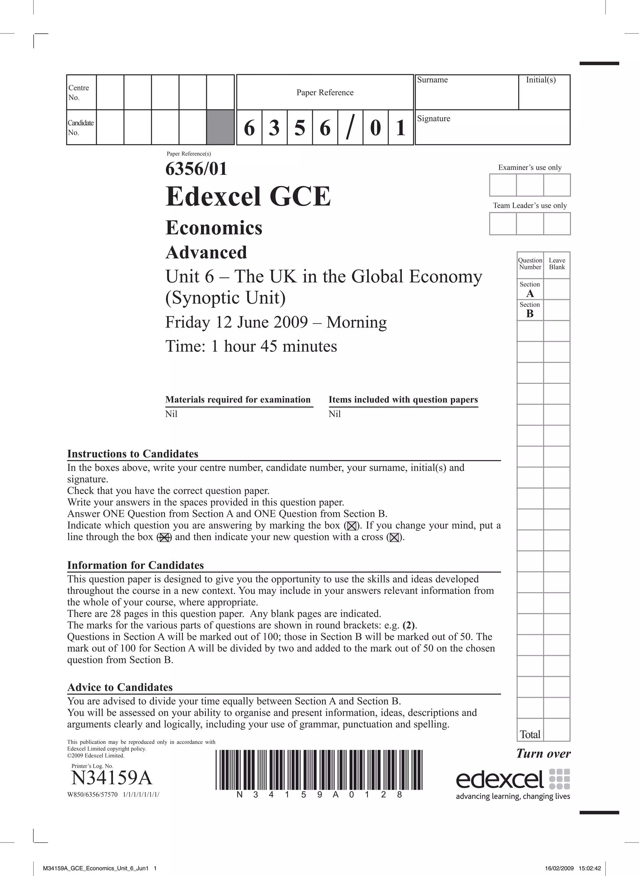 This document is an economics exam paper from June 2009 assessing understanding of the UK economy in a global context. It contains three multi-part questions in Section A asking students to examine and assess various macroeconomic issues facing the UK. Section B contains a data response question asking students to analyze UK macroeconomic imbalances and the global recession using supplied extracts and figures. The paper tests a range of economic concepts and requires students to apply their knowledge to analyze current economic conditions in a clear and logical manner.