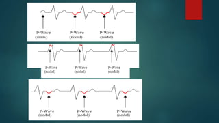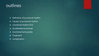 This document discusses junctional rhythms, which occur when the atrioventricular (AV) node acts as the backup pacemaker when the sinoatrial (SA) node fails. There are three types of junctional rhythm: junctional rhythm with a rate of 40-60 bpm; accelerated junctional rhythm with a rate of 61-100 bpm; and junctional tachycardia with a rate of 101-180 bpm. All junctional rhythms lack P waves or have inverted, buried, or retrograde P waves and a absent, short, or retrograde PR interval. Causes include SA node disease, increased vagal tone, digitalis use, and inferior wall myocardial infarction. Treatment options are