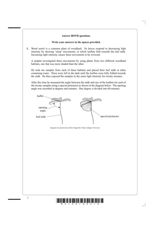 This document is an exam paper for a biology exam. It contains two questions about plant biology and earthworm ecology. Question 1 involves analyzing data from an experiment on leaf movement in wood sorrel plants from different light environments. Question 2 asks students to design an investigation comparing earthworm numbers in soil tilled with traditional versus chisel plowing. The paper provides space for students to show their work, includes guidance for candidates, and lists the total marks available for each question and the exam.