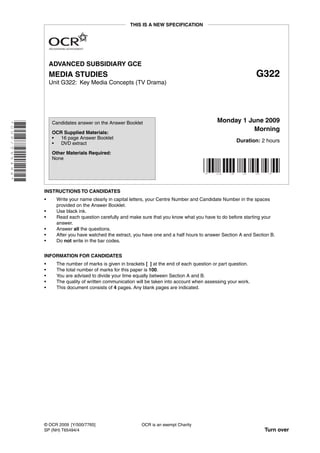 This document provides instructions for an exam on media studies focusing on TV drama. It outlines that candidates will watch a 5 minute extract from an episode of Doctor Who and answer questions about it. The first question analyzes the extract's representation of gender through techniques like camera shots, editing, sound, and mise-en-scene. The second question discusses the importance of technological convergence for institutions and audiences in one of several listed media areas, using examples from the candidate's case study research.