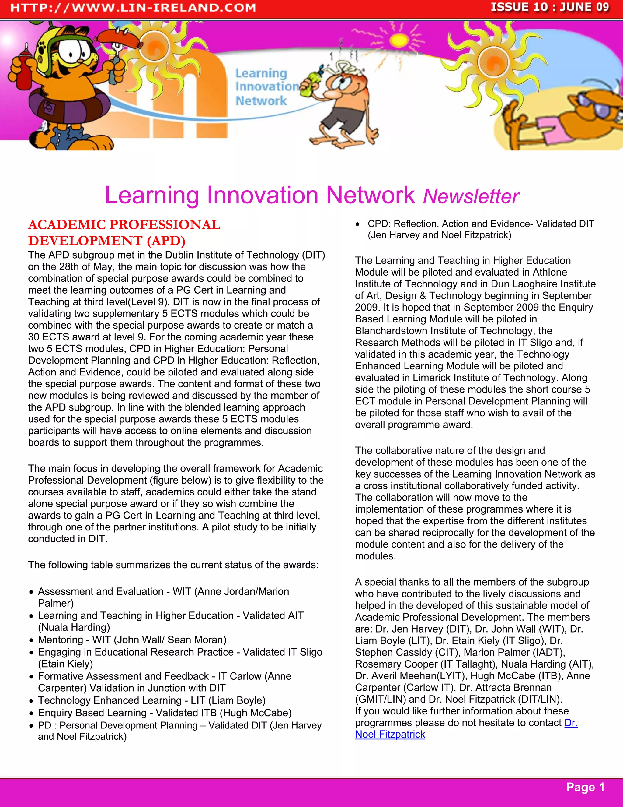The newsletter provides information on recent developments in academic professional development (APD) initiatives. DIT is validating two new 5 ECTS modules on reflection, action, and evidence as well as personal development planning that could be combined with other awards to obtain a PG Cert in learning and teaching. These modules and others developed by other institutions will be piloted in the coming academic year. The collaborative nature of developing these modules across institutions through the Learning Innovation Network has been a key success. The newsletter provides updates on the validation and piloting of various teaching and learning modules across different higher education institutions in Ireland.