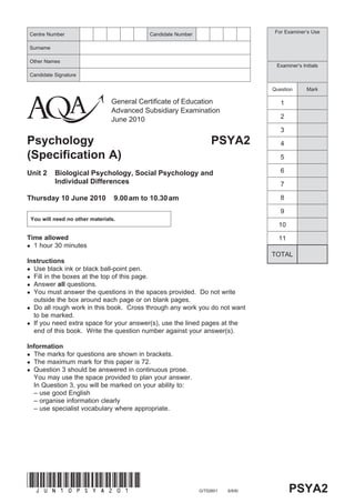 The document appears to be an exam paper for psychology. It contains 11 multiple choice and essay questions testing knowledge of biological psychology, social psychology, and individual differences. The exam covers topics like stress and health, conformity, abnormal psychology, and therapies for depression. Candidates are instructed to answer all questions in the spaces provided in 1 hour 30 minutes, showing their working. Scores are marked out of a total of 72 marks.