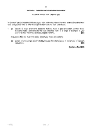 This document provides instructions for a GCE Media Studies exam. It outlines that students must answer two questions from Section A on theoretical evaluation of media production, and one question from Section B on contemporary media issues. For Section A, students must describe creative decisions made in post-production and how they constructed meaning in one of their coursework productions. For Section B, they must discuss examples from at least two media areas and address historical, contemporary and future media in their chosen question. The document provides a list of 12 questions across various media topics for students to choose from for Section B.