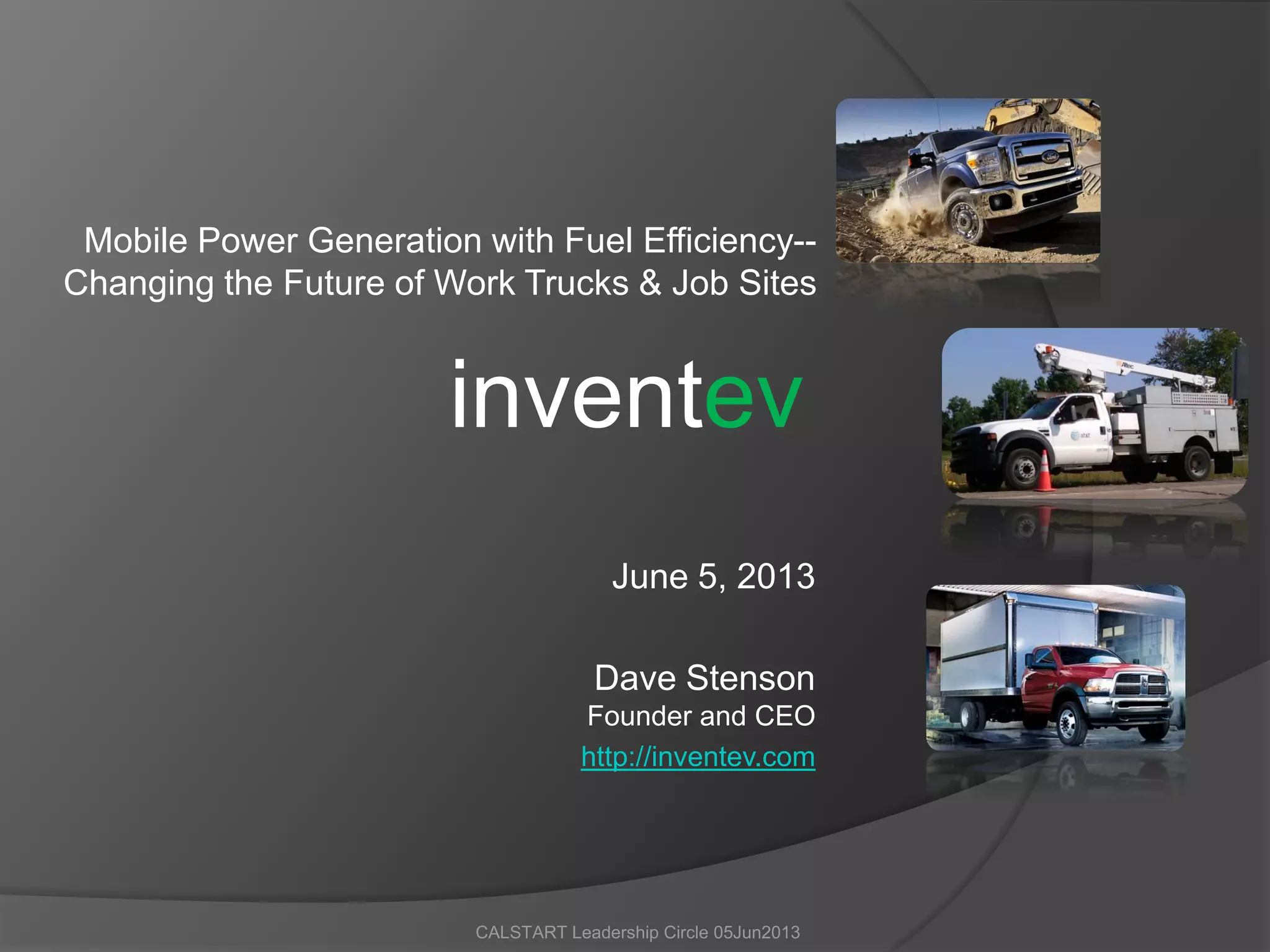 The document discusses a startup company called Inventev that is developing plug-in hybrid electric powertrains for medium-duty commercial trucks. Inventev sees an opportunity to electrify these trucks which have been less prioritized than other vehicle classes. Their system would allow trucks to operate for 30-50 miles on battery power alone or use the engine as a range extender. It would also enable mobile power generation at job sites to reduce idling and provide electricity during outages. Inventev believes their technology can save fleets over $8,000 in fuel costs compared to diesel trucks and provide a payback period of under 4 years.