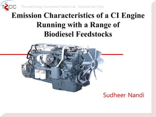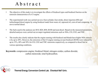 The document discusses a study that investigated the effects of different biodiesel types and biodiesel fractions on emission characteristics of a compression ignition engine. The study found that biodiesel from different feedstocks did not significantly affect emissions as long as fuel properties remained the same. Emissions of CO2, CO and THC decreased with increasing biodiesel content, while NOx emissions increased. The conclusions were that biodiesel reduces emissions except for NOx, and the feedstock source does not significantly impact emissions.