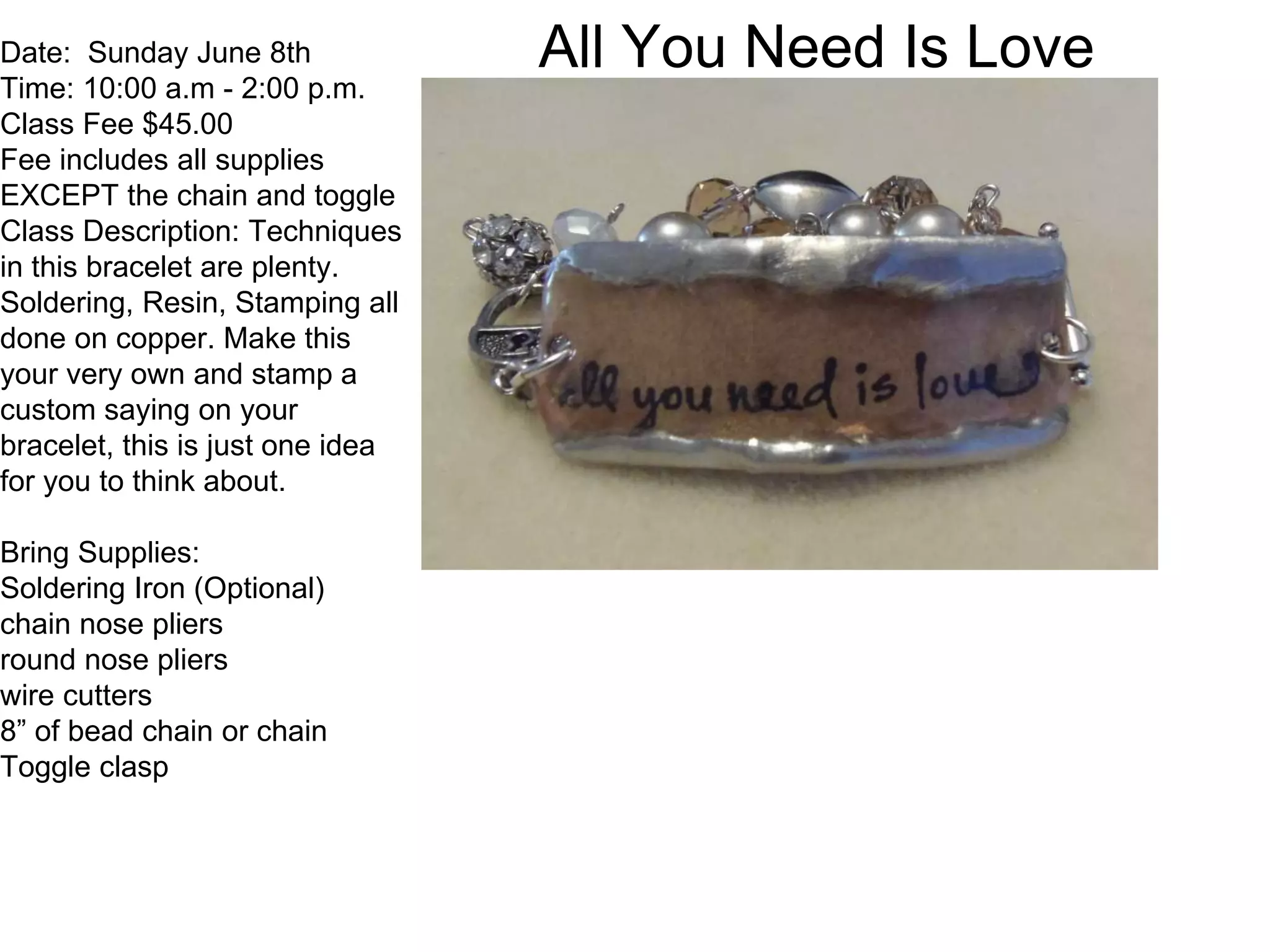 1) An "All You Need Is Love" bracelet class on June 8th for $45 including supplies except chain and toggle, where techniques like soldering, resin, and stamping will be used on copper bracelets.