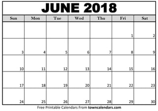 The document contains 4 printable calendar pages for June 2018, with each page showing the month of June broken down by week with dates and days of the week listed. At the bottom of each page it notes that the calendars are free and printable from the website towncalendars.com.