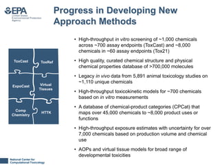 This document summarizes progress made and remaining challenges in developing new approach methods for regulatory toxicology assessments. It outlines several new approach methods developed including high-throughput in vitro screening databases and models. However, it notes remaining scientific challenges including limited metabolic and biological complexity of current in vitro assays and gaps in exposure and dosimetry data. The document also discusses philosophical challenges in validating new approach methods, defining adversity at the molecular level, and gaining acceptance for qualitative and quantitative uncertainties compared to traditional animal studies.