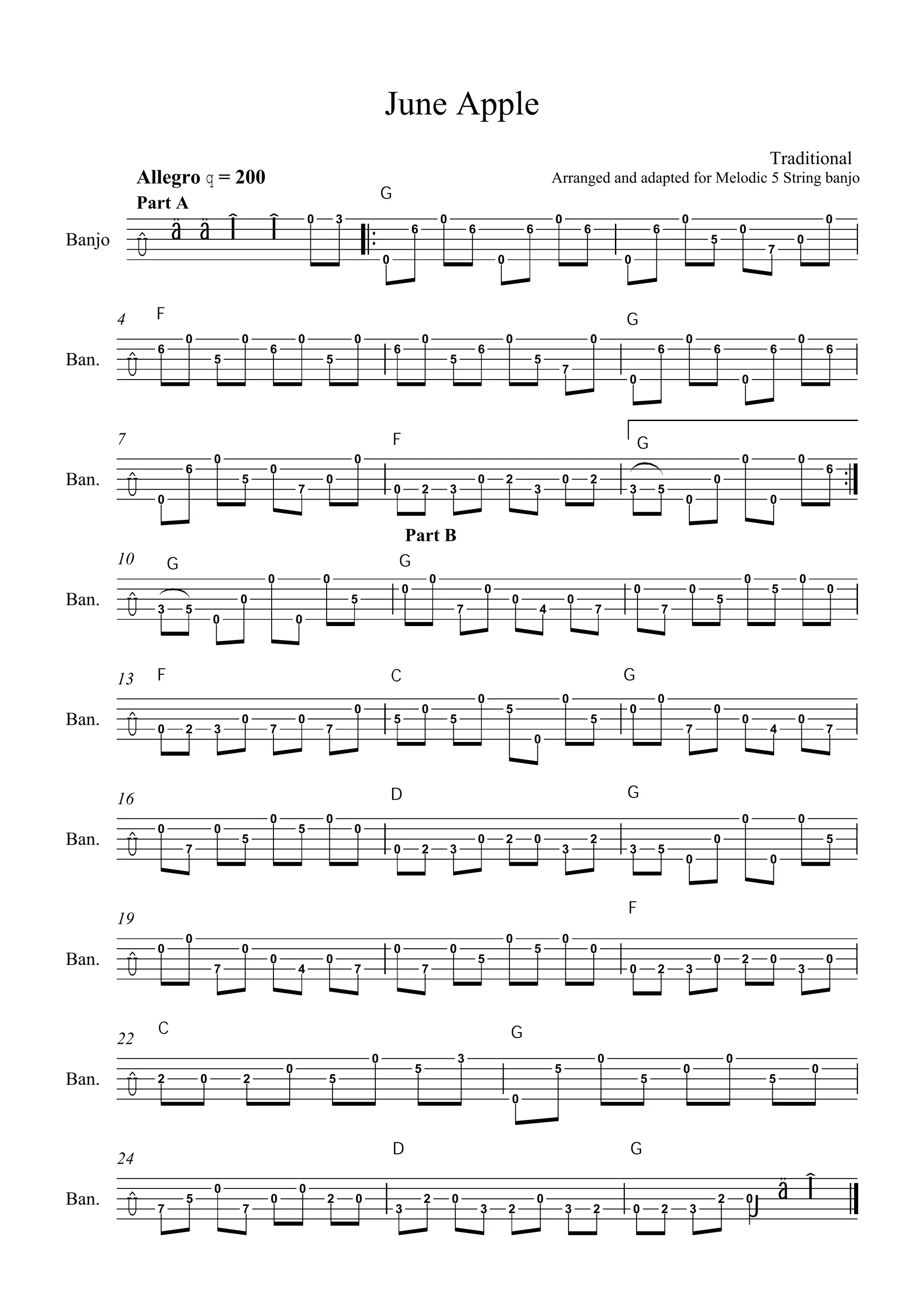 The document contains sheet music for an arrangement of the traditional tune "June Apple" for the 5-string melodic banjo. The sheet music is divided into two parts, with Part A and Part B providing the musical notation, including notes, rhythms, and dynamics to be played on the banjo. The sheet music also includes the tempo marking of Allegro q=200 at the top to indicate how quickly the piece should be played.