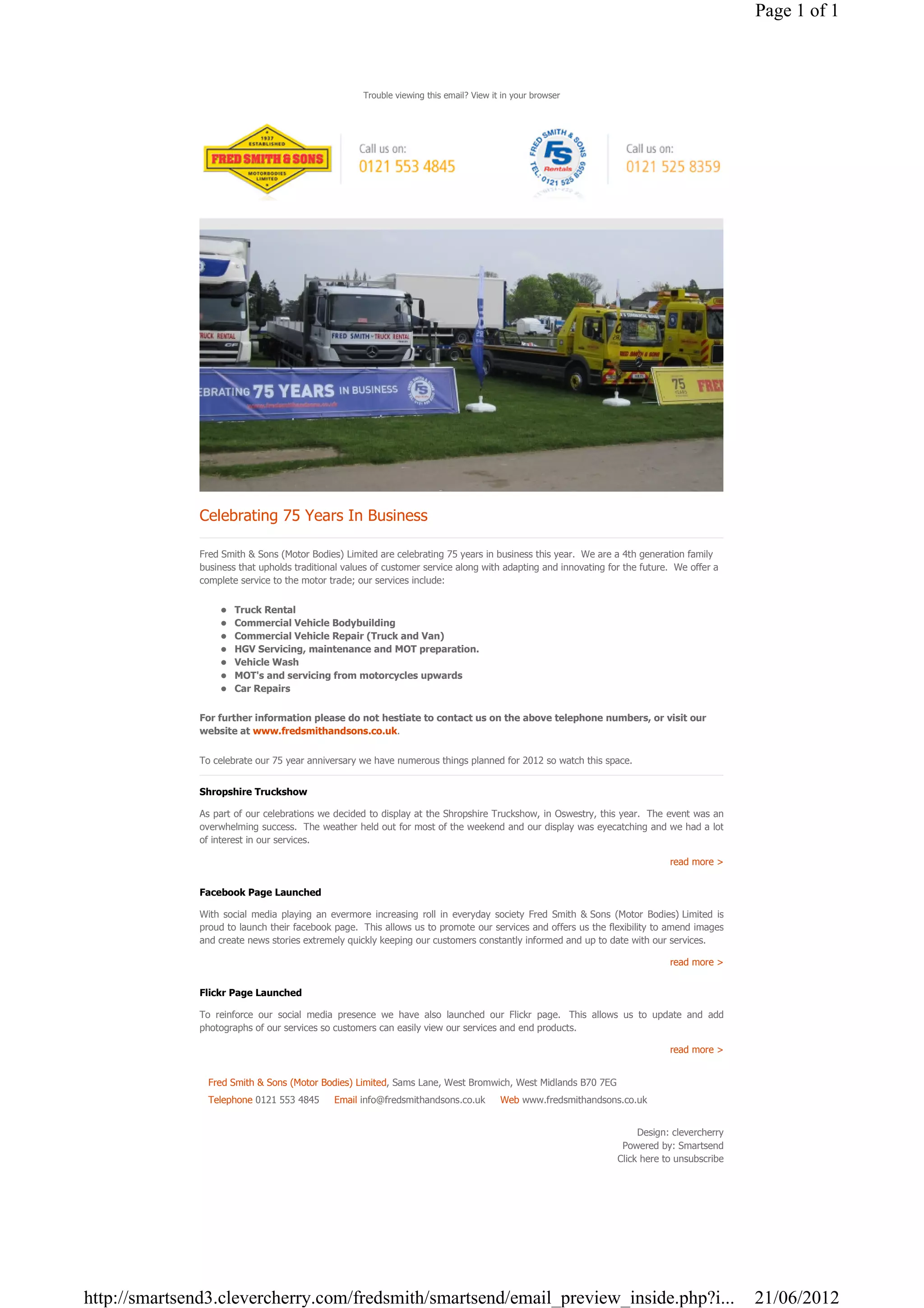 Fred Smith & Sons (Motor Bodies) Limited is celebrating their 75th anniversary in 2012 as a 4th generation family business providing commercial vehicle services. They offer truck rental, bodybuilding, repair, servicing, washing, and MOT preparation for trucks, vans, motorcycles and cars. To celebrate their anniversary, they displayed at the Shropshire Truckshow and launched Facebook and Flickr pages to promote their services and share photos.