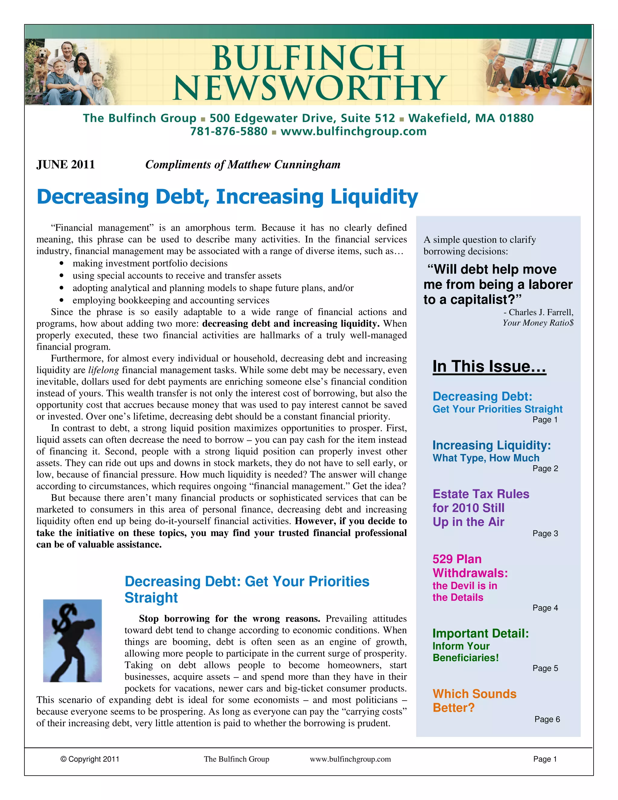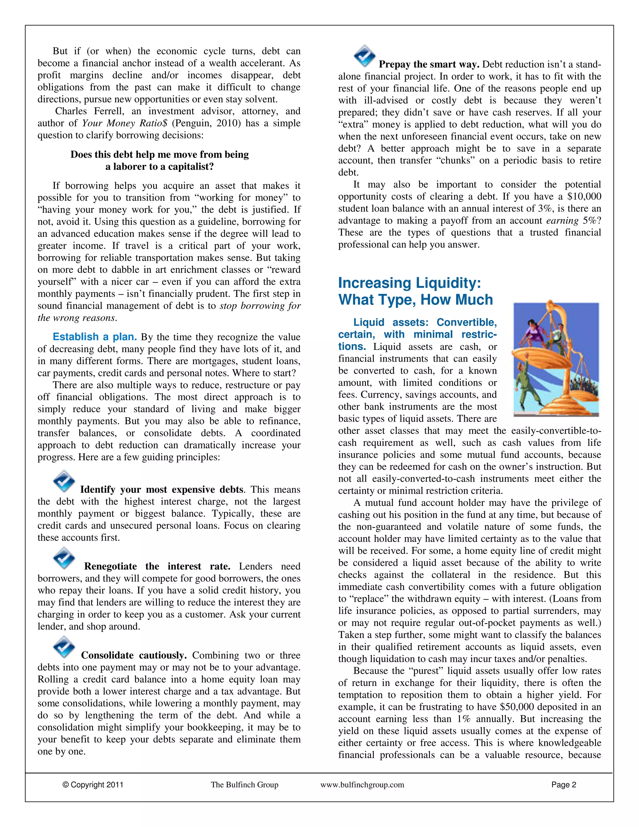 This document discusses decreasing debt and increasing liquidity as important aspects of financial management. It provides guidance on establishing priorities and plans for reducing debt, such as focusing on the highest interest debts first and renegotiating interest rates. It also discusses the importance of maintaining adequate liquidity through liquid assets and cash reserves. The document recommends working with a financial professional to properly coordinate debt reduction and liquidity goals.