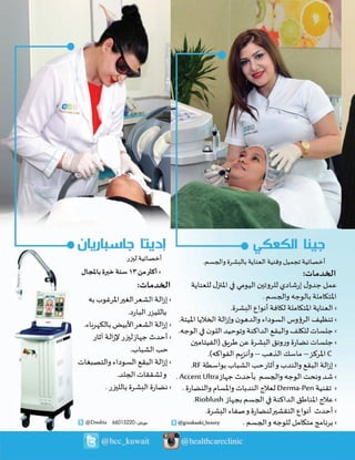 تقدم الوثيقة معلومات حول خدمات عيادة طبية تجميلية تشمل تقنيات مثل إزالة الشعر بالليزر، التخسيس، وتجميل الأسنان. وتحتوي على تفاصيل عن العلاجات المتاحة، الأسعار، وطرق الاتصال مع العيادة. تسلط الوثيقة الضوء على الجودة العالية والخصوصية التي توفرها العيادة لعملائها.