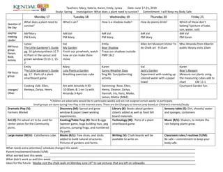 This document summarizes a week-long study conducted by teachers Mary, Valerie, Karen, Emily, and Lynea from June 17-21, 2019. The focus of the study was on what plants need to survive. Each day, the class explored a different question related to this topic through activities led by various teachers in small focus groups during morning and afternoon meetings. Interest areas in the classroom were modified based on the study with additions like a sprout and grow window, books about gardens, and gardening materials in the sensory table and dramatic play area. The document outlines the daily schedule, activities, and teacher assignments for the week and reflects on what aspects of the study worked well and could be improved going forward.