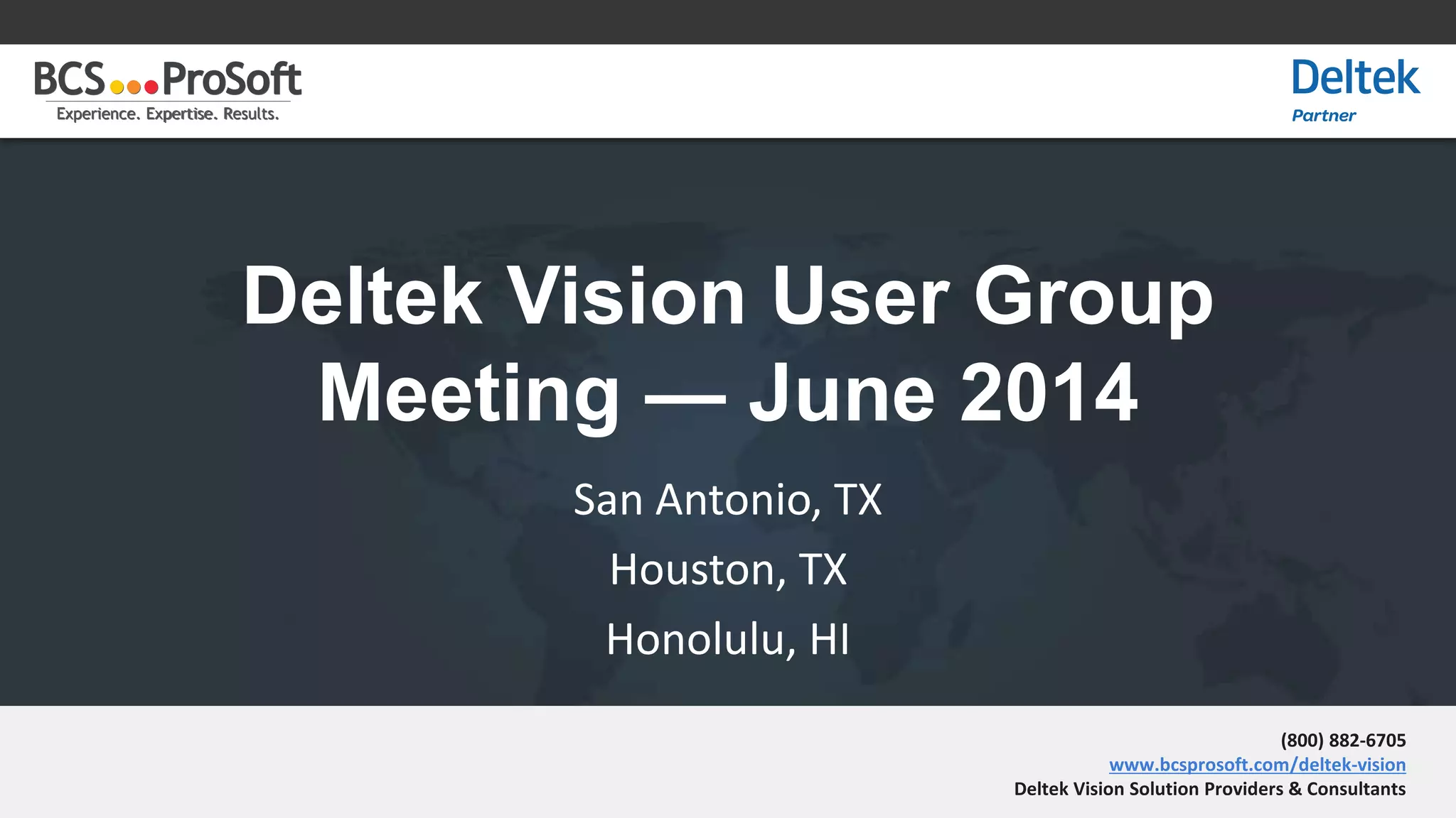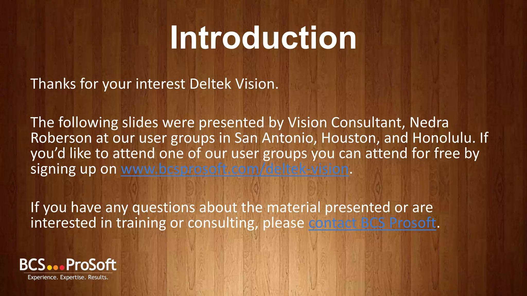 The document outlines a presentation given by Nedra Roberson, a vision consultant at BCS ProSoft, during Deltek Vision user group meetings in June 2014. It covers various topics including consultant accruals, ledgers, and tips for effectively using the Deltek Vision software. Additionally, it highlights upcoming features in Deltek Vision 7.3 and encourages attendees to join local user groups for further engagement.