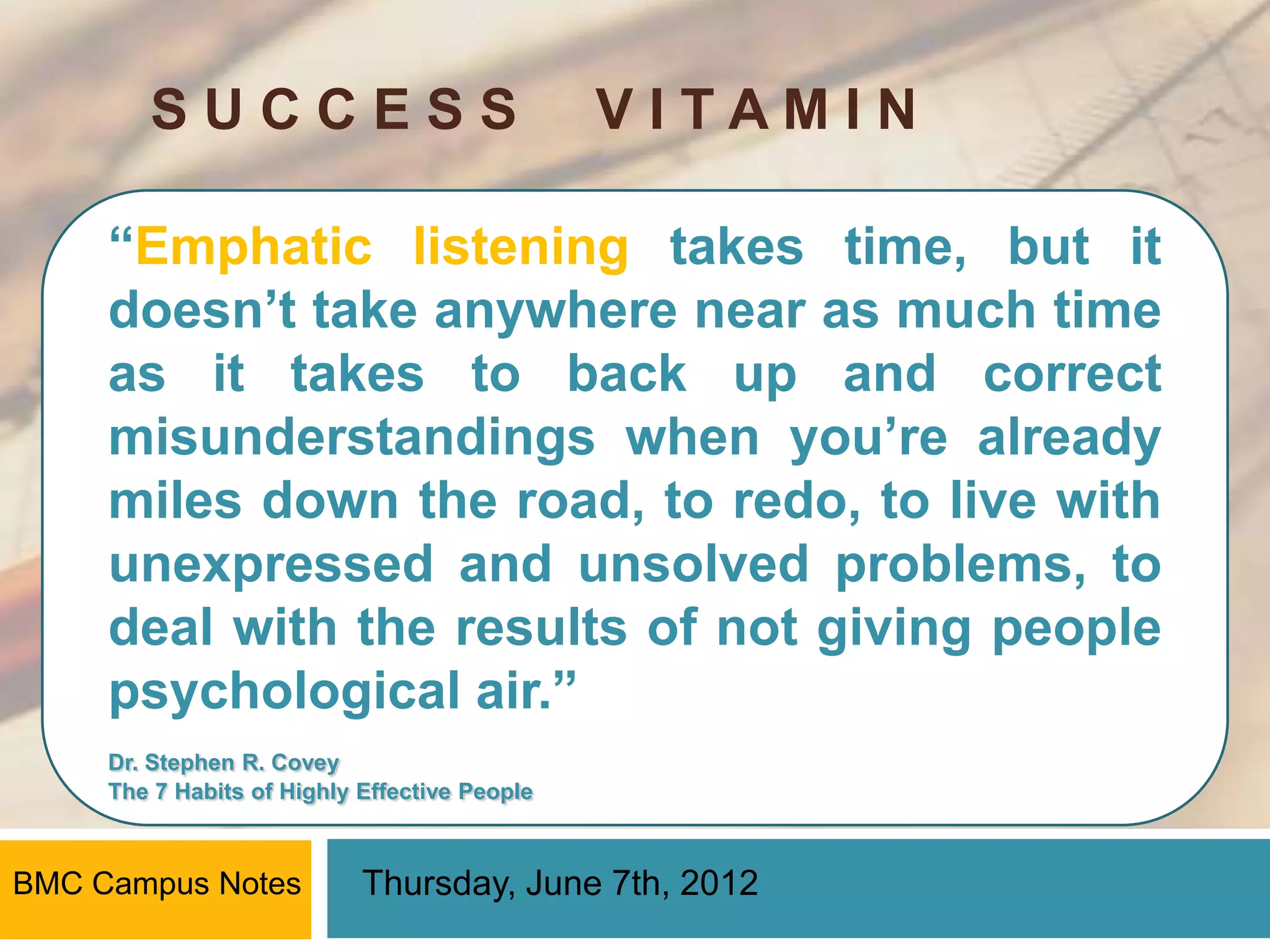 Emphatic listening takes time but prevents future misunderstandings. Dr. Stephen Covey notes it is better to listen fully now than have to redo work later due to unresolved issues. The campus is hosting AVP portfolio presentations on June 19th from 11am to 2pm. Students can sign up for free computer literacy workshops on Wednesdays and Fridays from 2-4pm in room 107 to get help with basic computer skills.