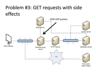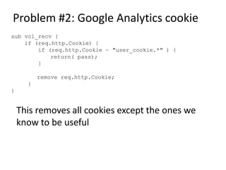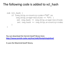 Varnish is a reverse proxy cache that is designed to accelerate HTTP-based websites. It uses a domain-specific configuration language called VCL to define backend servers, caching rules, and other settings. Key aspects of the Varnish configuration covered include backend definitions, directors, vcl_recv for caching rules, vcl_hash for object identification, and vcl_fetch for backend object handling. The document discusses using Varnish to cache the homepage of a website called KeezMovies, addressing challenges of geolocation, analytics cookies, and non-idempotent requests.