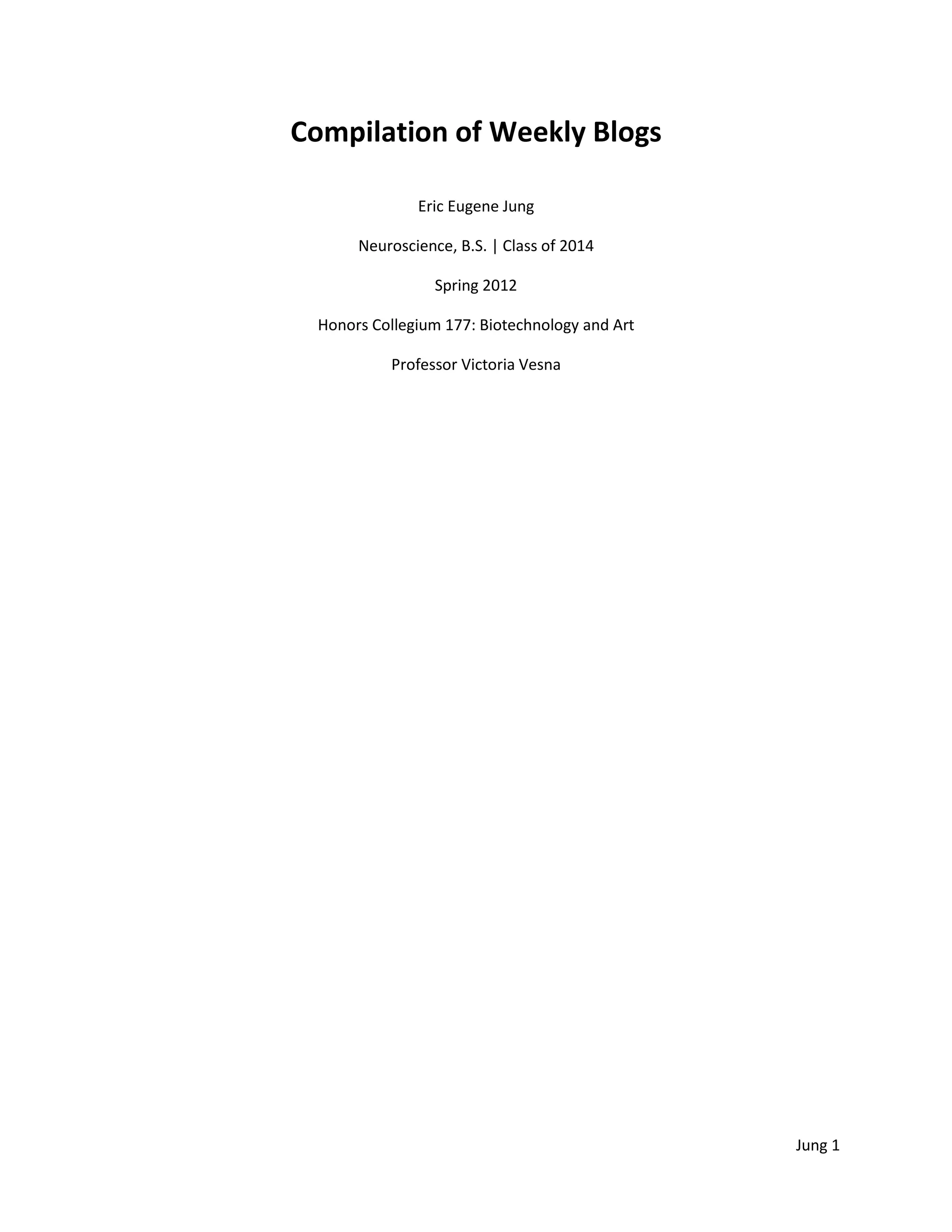 This document appears to be a compilation of weekly blog posts from a student named Eric Jung for a class on Biotechnology and Art during the spring of 2012. Over the course of 10 weeks, Jung explores a variety of topics at the intersection of biology and art. In his closing remarks, Jung reflects on how the distinction between art and biology has blurred, and discusses how the class taught him that science can have frightening aspects but pursuing it through both a scientific and artistic lens may lead to a deeper understanding of technology's possibilities.