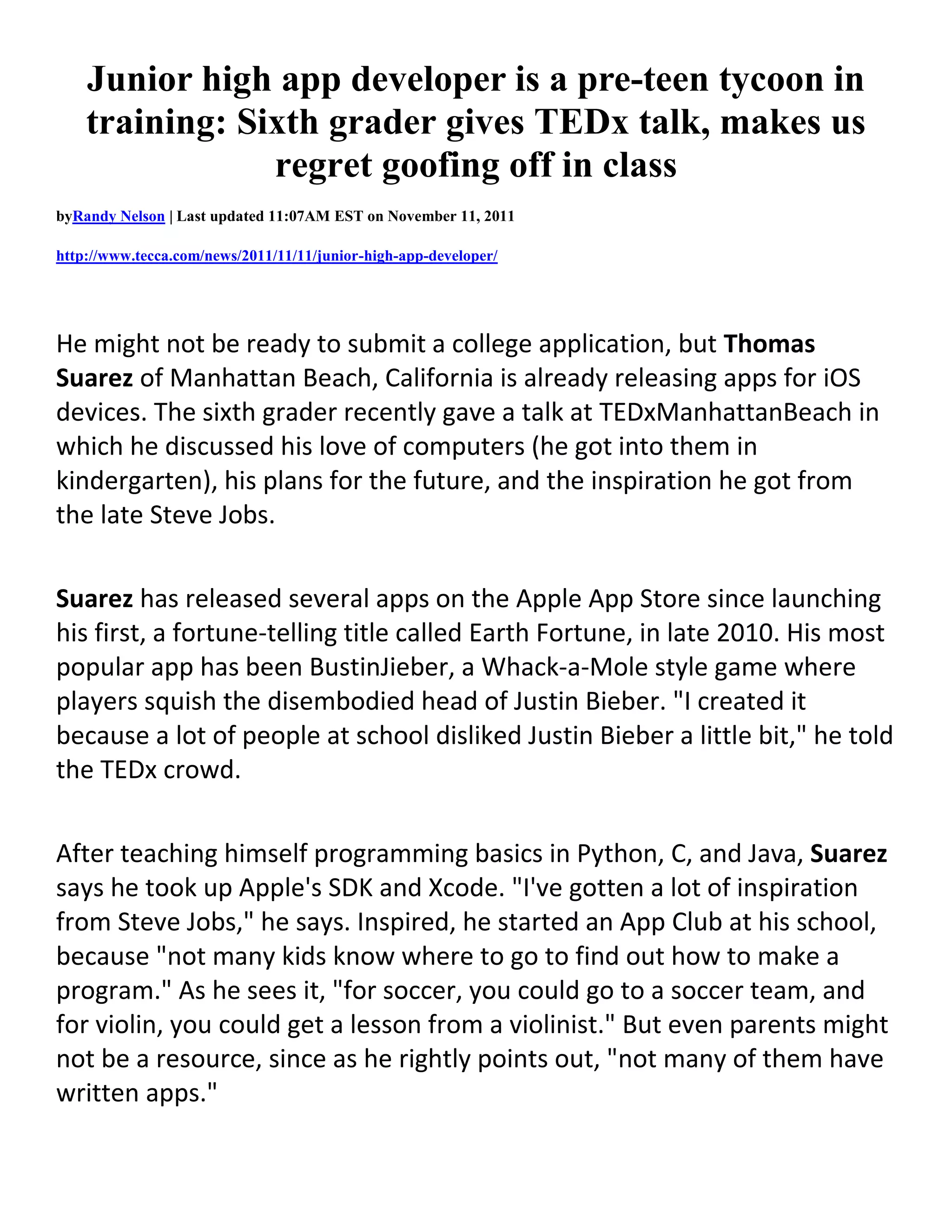 A sixth grader from Manhattan Beach, California named Thomas Suarez has been developing apps for iOS devices and has given a TEDx talk about his passion for computers and plans to continue developing apps. He taught himself programming languages and used Apple's SDK and Xcode to create his first app in 2010. Since then he has released several more apps on the Apple App Store. His most popular app allows users to squish the head of Justin Bieber. He has also started an App Club at his school to teach other students app development.