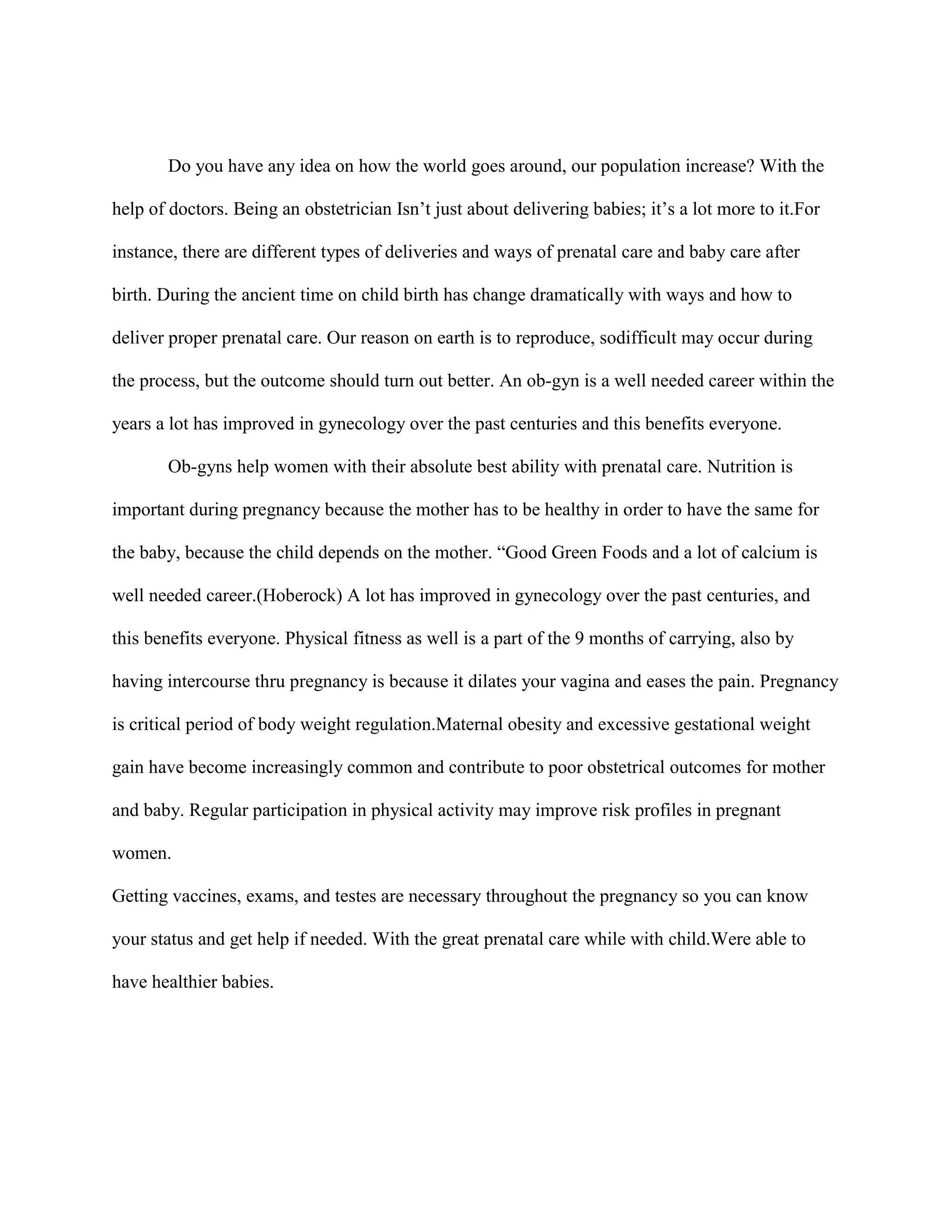This document discusses the role of obstetricians and how childbirth has changed over time. It notes that obstetricians provide important prenatal care like nutrition guidance and help with delivery. They also perform tests and exams throughout pregnancy. Childbirth methods have evolved significantly with modern equipment and medical knowledge compared to ancient times. Cesarean sections were once rare but are now more common when needed. Care of newborns has also changed with practices like the Apgar test and premature baby care. Midwives also support the delivery process and require educational training.