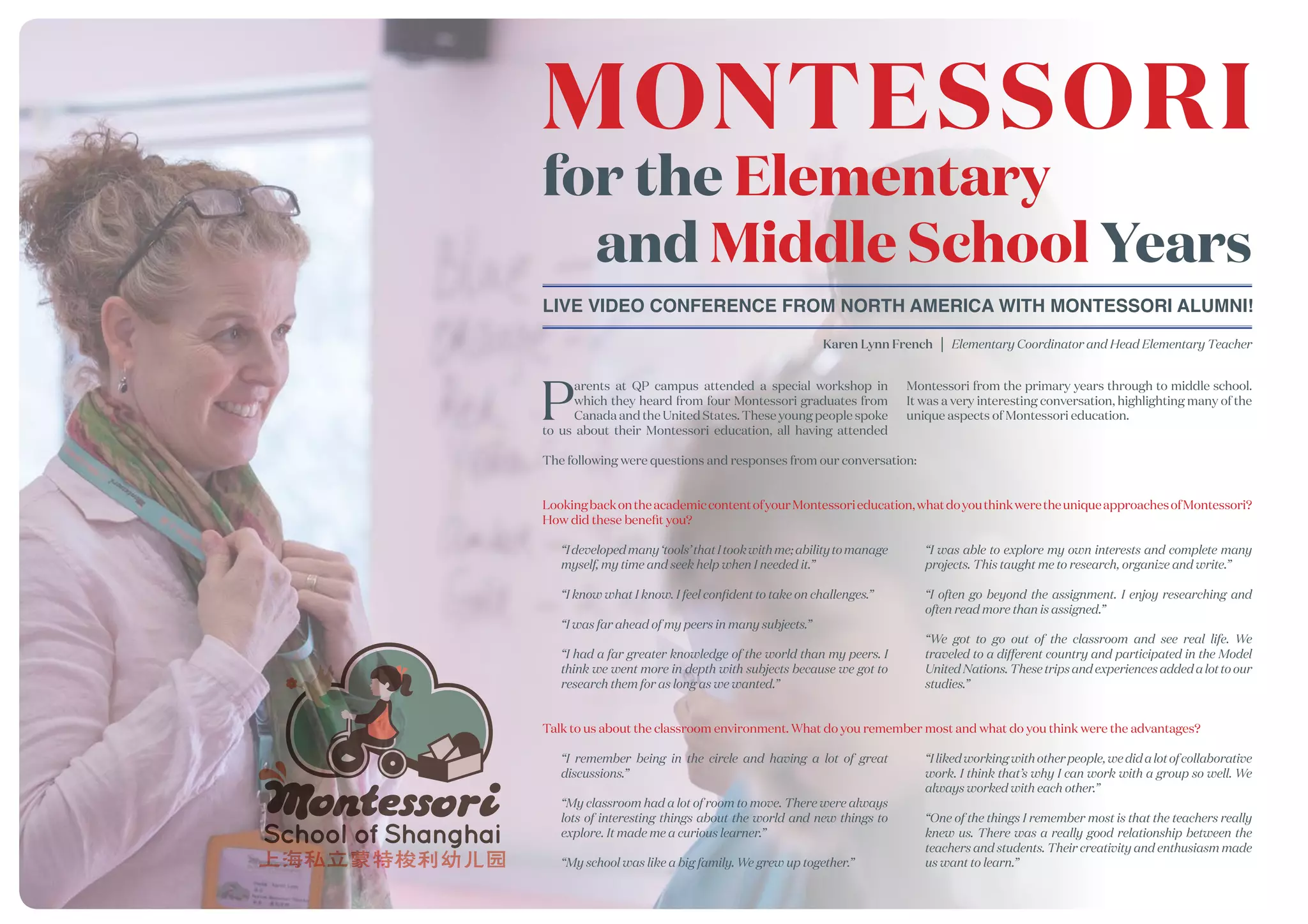This document summarizes a live video conference with Montessori alumni from North America. Four graduates spoke about their positive Montessori experiences from primary through middle school. They discussed how Montessori education helped develop life skills and confidence. The unique classroom environment fostered curiosity, collaboration, and strong student-teacher relationships. The alumni felt well-prepared transitioning to more traditional schooling and would recommend Montessori to others.