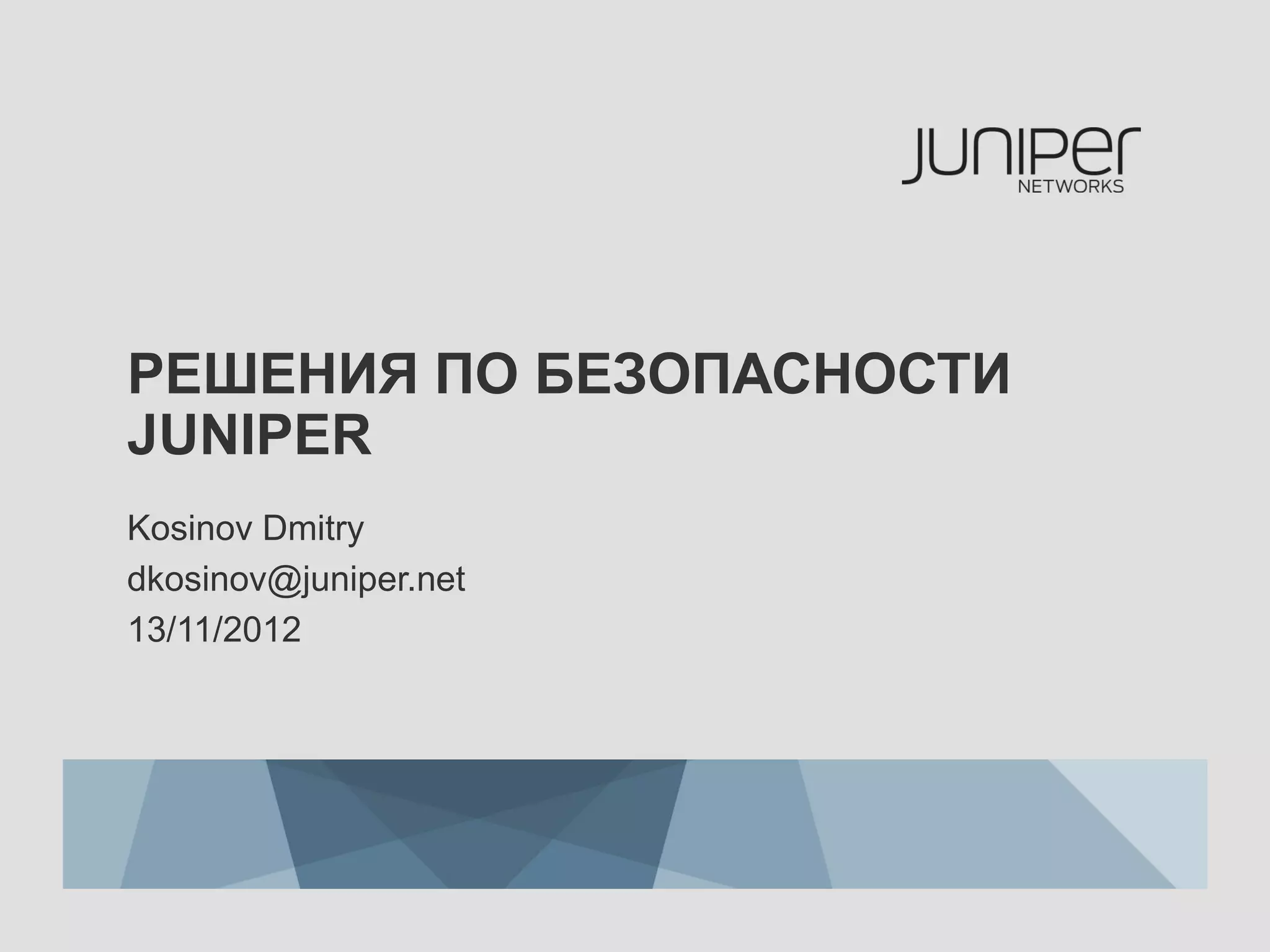 Документ описывает решения по безопасности от компании Juniper Networks, включая защиту корпоративной сети, ресурсов ЦОД и хостинг сервисов с использованием межсетевых экранов, контроля доступа и управления событиями безопасности. Juniper предлагает интегрированные end-to-end решения с высокой надежностью, производительностью и возможностью масштабирования для разных типов использования. Также в документе рассматриваются особенности защиты виртуальных сред и новые модули для обеспечения безопасности на уровне гипервизора.