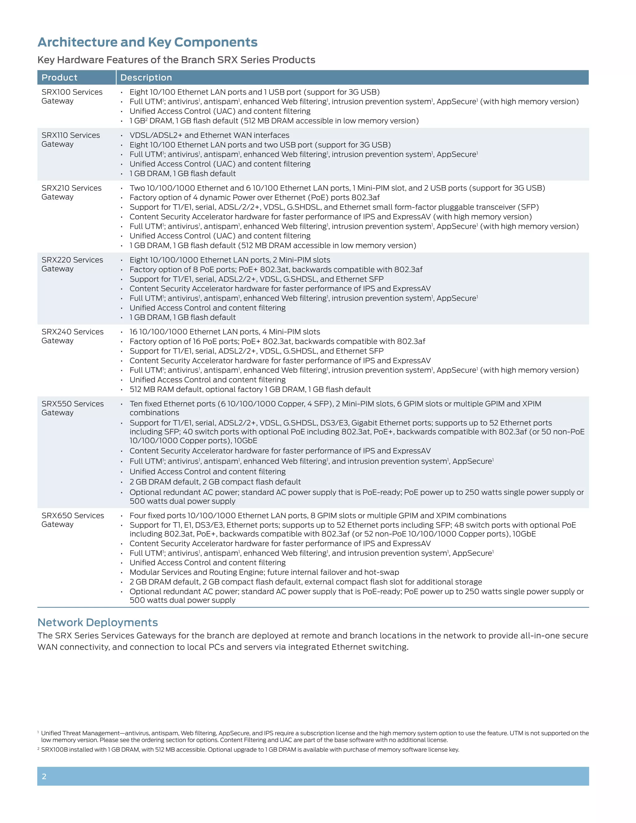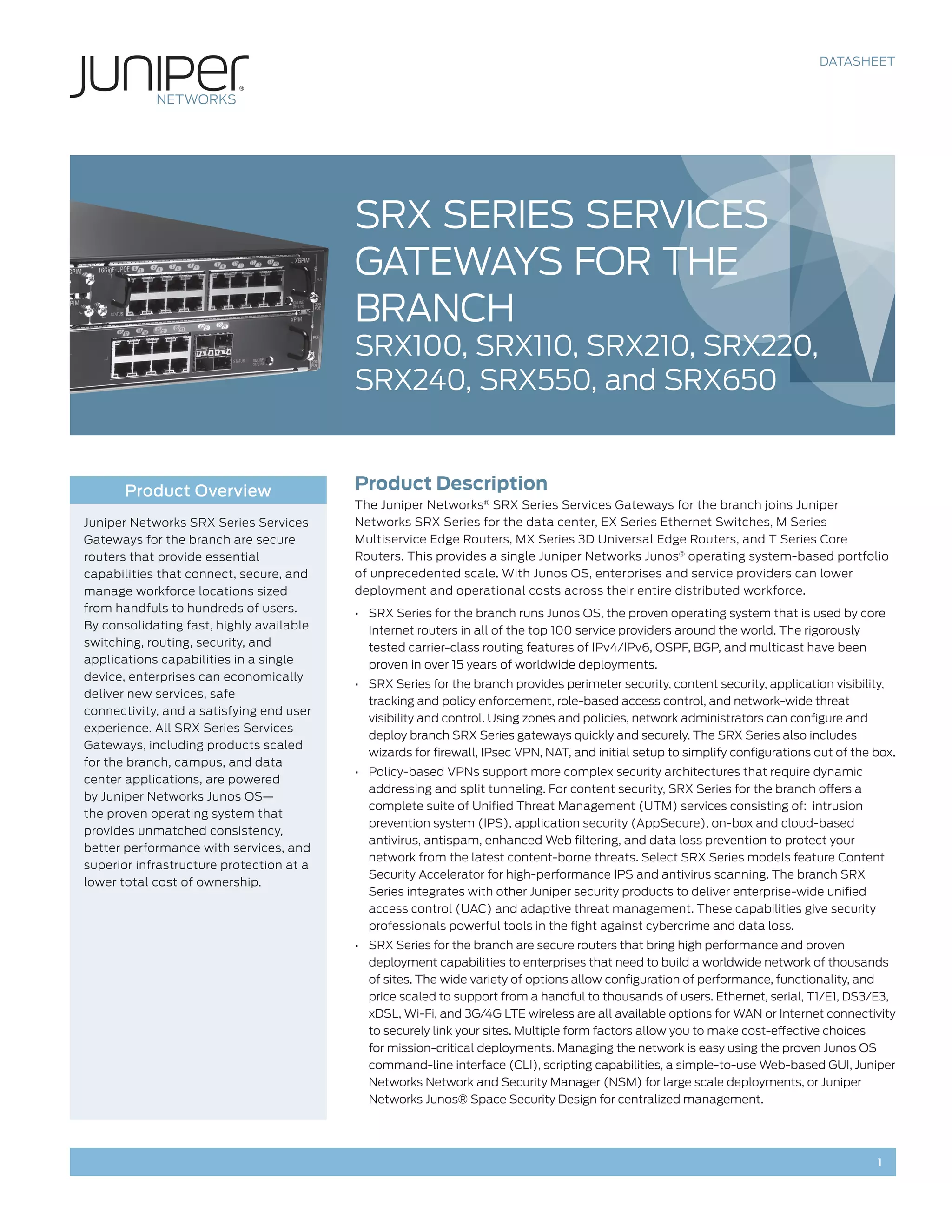 The document is a datasheet that describes Juniper Networks' SRX Series Services Gateways for branches. It summarizes that the SRX Series provides secure routing, switching, security and application capabilities in a single device to economically deliver services and safe connectivity for workforces ranging from handfuls to hundreds of users. It then provides details on the product overview, key hardware features, and architecture of the various SRX models scaled for branch office needs, including the SRX100, SRX110, SRX210, SRX220, SRX240, and SRX550.