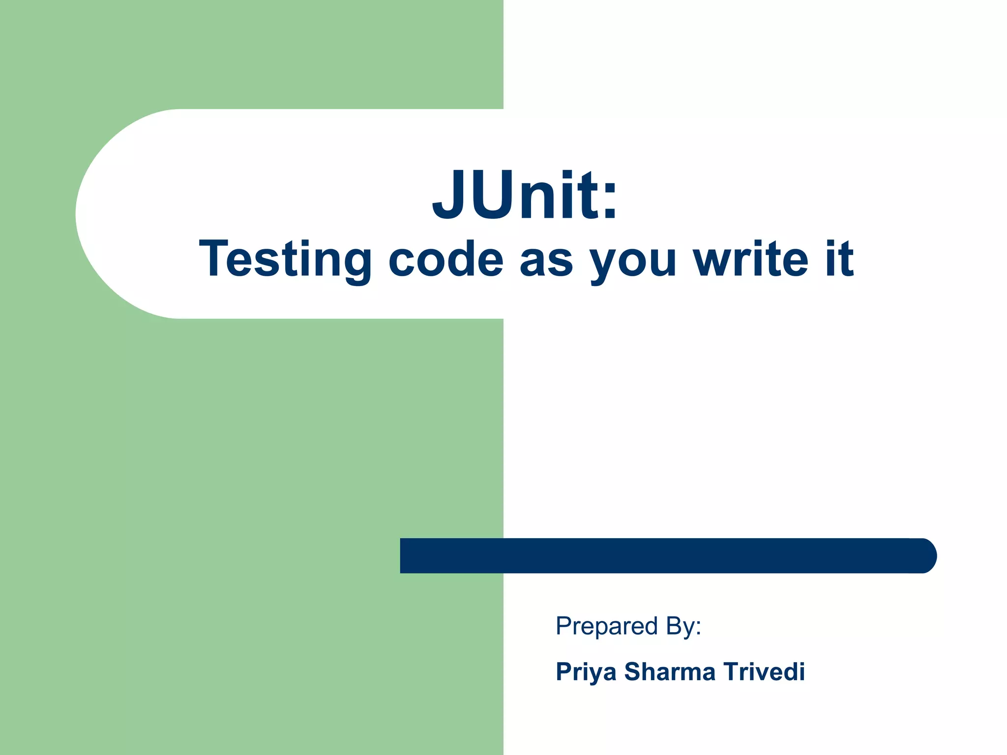 JUnit is an open-source framework for writing and running tests in Java, enabling developers to implement unit tests during the coding process for easier verification and regression testing. It allows easy setup of test classes and suites, providing methods for assertions and a graphical user interface to track test progress. The document provides guidelines for installation, writing tests, naming standards, and examples demonstrating the framework's functionality and best practices.
