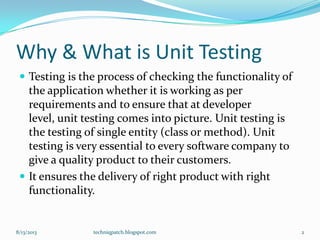 The document provides an overview of unit testing, focusing on JUnit, a regression testing framework for Java. It details the process and components of unit testing, including test cases, fixtures, test suites, and the execution flow, along with practical examples. It also introduces TestNG as an alternative framework with enhanced features for testing in Java.