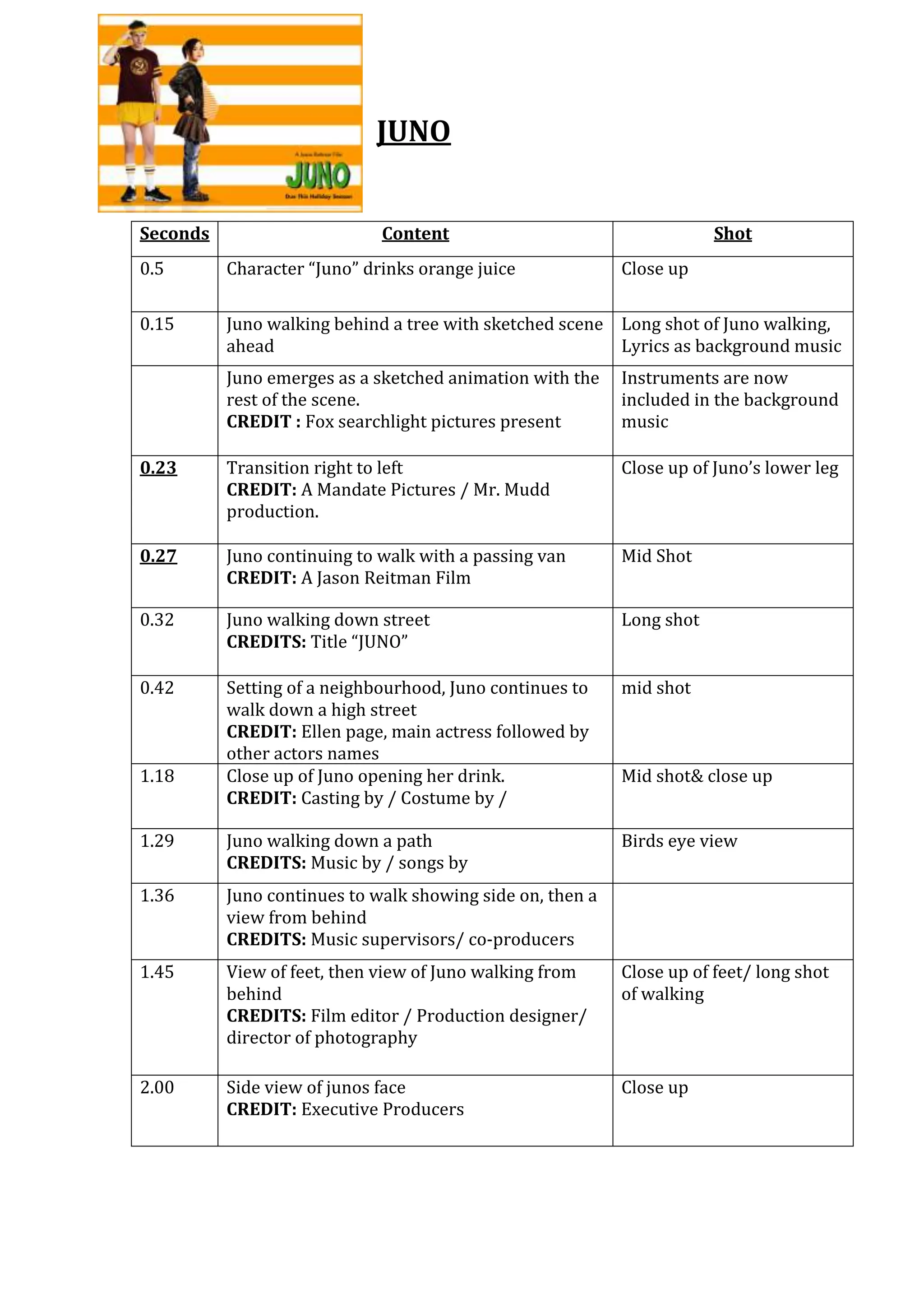 The document is a shot log from the film Juno. It describes various shots of the character Juno walking through a neighborhood and drinking orange juice over the course of 2 minutes. With each shot description, credits for the film are displayed such as the director, producers, cast, and crew.