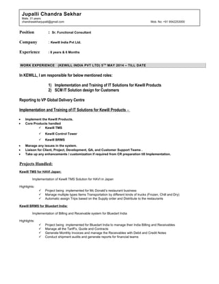This document contains the resume of Jupalli Chandra Sekhar, a 31-year-old male from India with over 8 years of experience in supply chain management and IT solutions. He has worked at Kewill India Pvt Ltd, Geodis Overseas India Pvt Ltd, and Infolog Solutions Pvt Ltd in roles such as functional consultant, domain analyst, and product specialist. His experience includes implementing supply chain management software, designing IT solutions, and analyzing customer logistics operations. He holds a Master's degree in International Business and a Bachelor's degree in Mechanical Engineering.