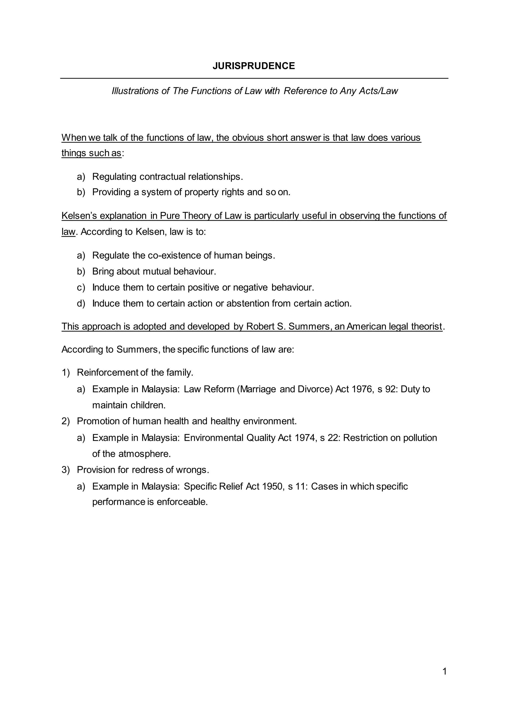 Law serves several important functions: 1) To regulate human behavior and interactions such as contractual relationships and property rights. 2) To induce certain positive behaviors and abstention from negative behaviors in order to facilitate coexistence. 3) Specific functions include reinforcing the family through laws on child support, promoting public health and environmental protection through pollution laws, and providing legal recourse for wrongs through laws allowing specific performance in contracts.