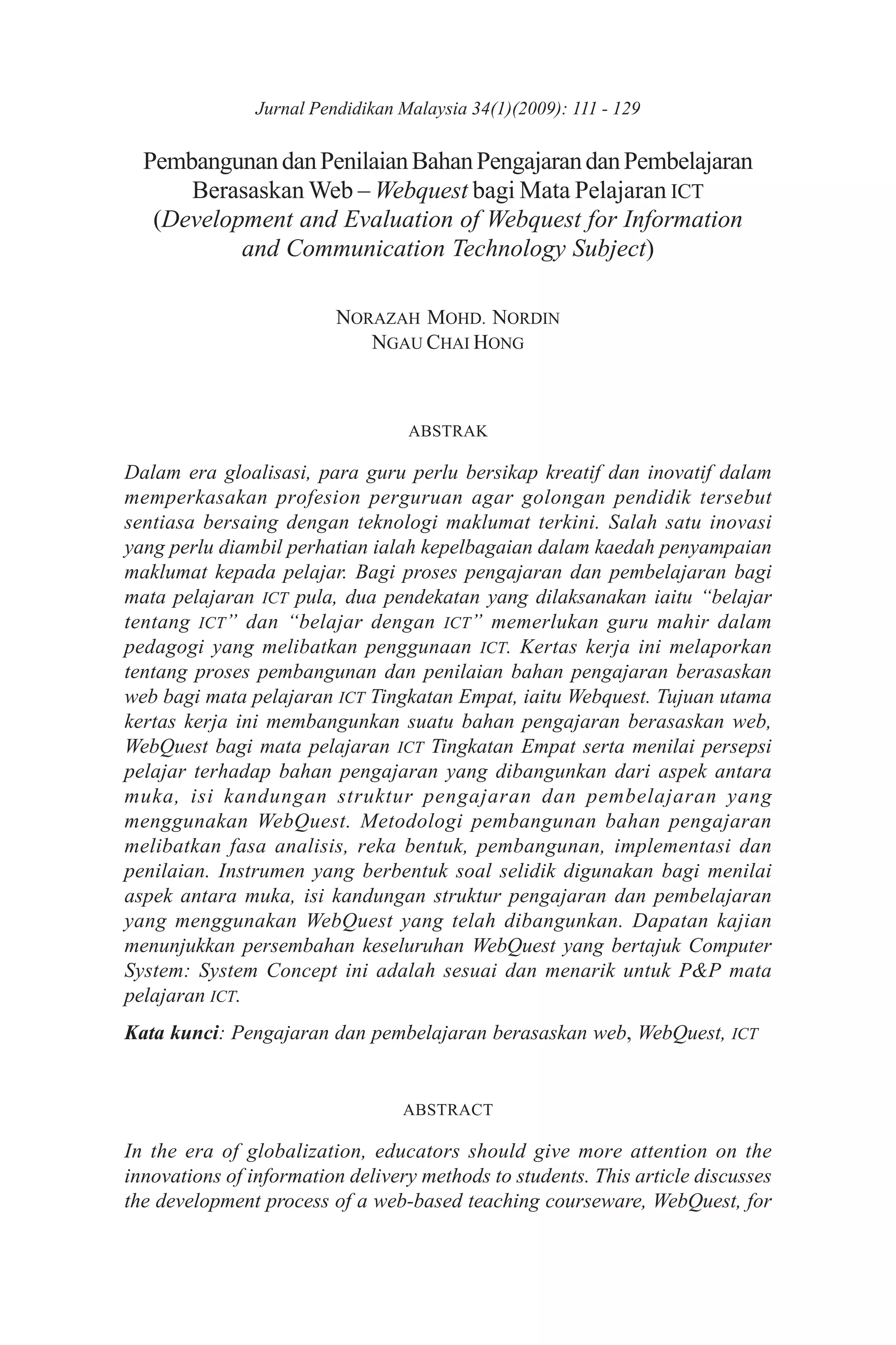 Dokumen ini membahas pembangunan dan penilaian bahan pengajaran berasaskan web, iaitu webquest, untuk mata pelajaran ICT di tingkatan empat. Ia menekankan pentingnya kreativiti guru dan integrasi teknologi dalam pengajaran, serta melibatkan penilaian keberkesanan bahan berdasarkan persepsi pelajar. Hasil kajian menunjukkan bahawa webquest yang dibangunkan adalah menarik dan relevan untuk proses pengajaran pelajar.